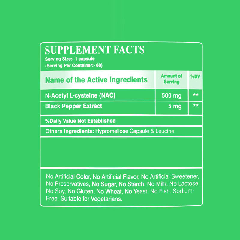 معزز بمستخلص الفلفل الأسود: مُصمم بـ 5 مجم من البيبيرين لتحسين امتصاص NAC، مما يضمن حصولك على أقصى فائدة في كل جرعة.