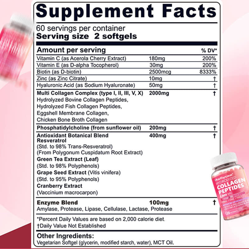 جيلات الكولاجين الرخوة لدينا مخصبة بأربعة خليطات نباتية عضوية وفيتامينات (ج) و (إي) و (بيوتين) والزنك لتعزيز مضادات الأكسدةوكذلك المكونات الداعمة للهضم والتكسر لتعزيز الامتصاص الفعال.