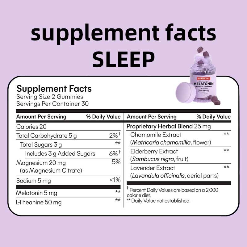 Melatonin, Magnesium, L-Theanine, Chamomile, Lavender, Elderberry.